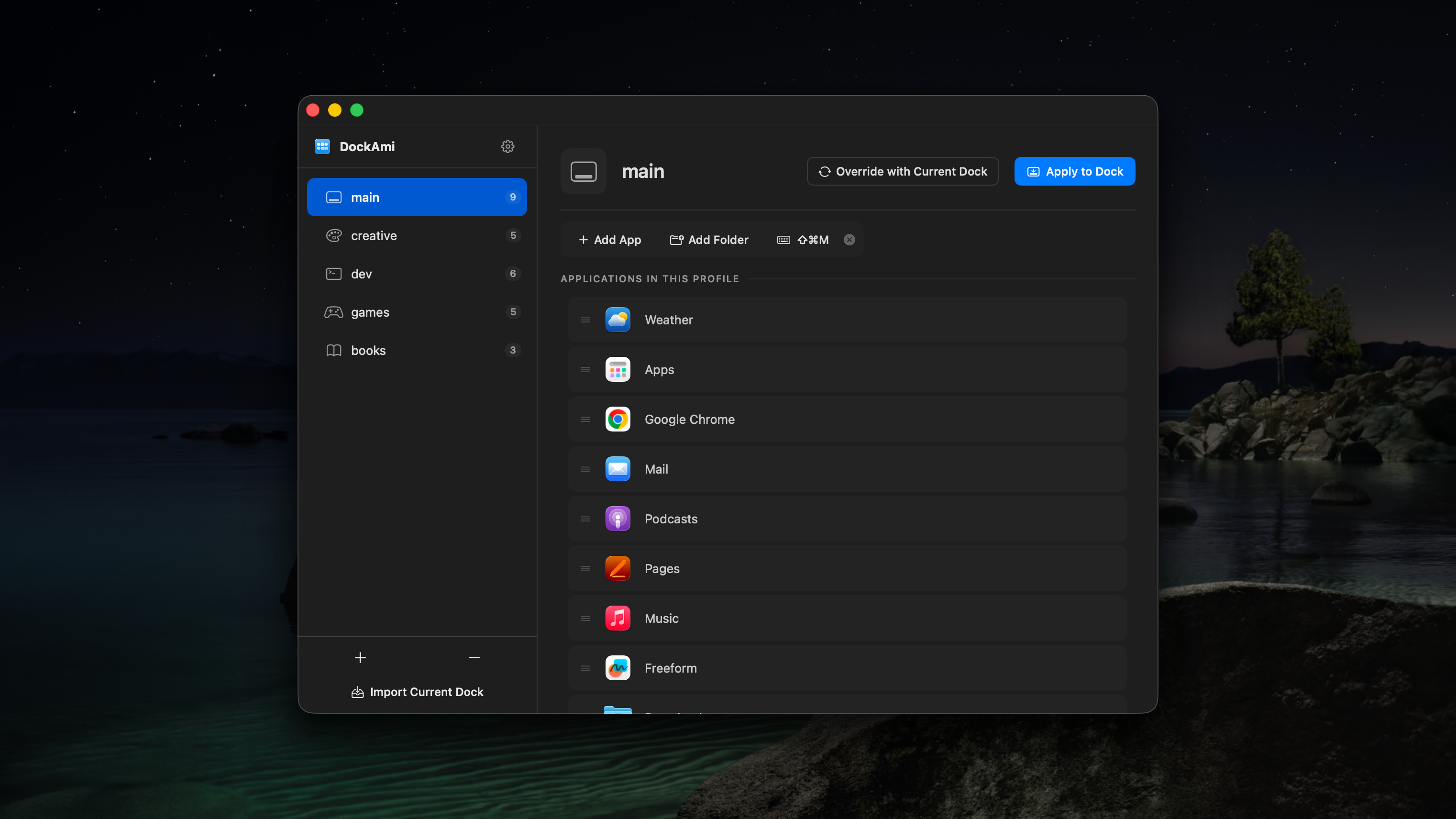 Create multiple Dock profiles and switch between them in a click. One Dock for coding, another for design, another for music — you decide.