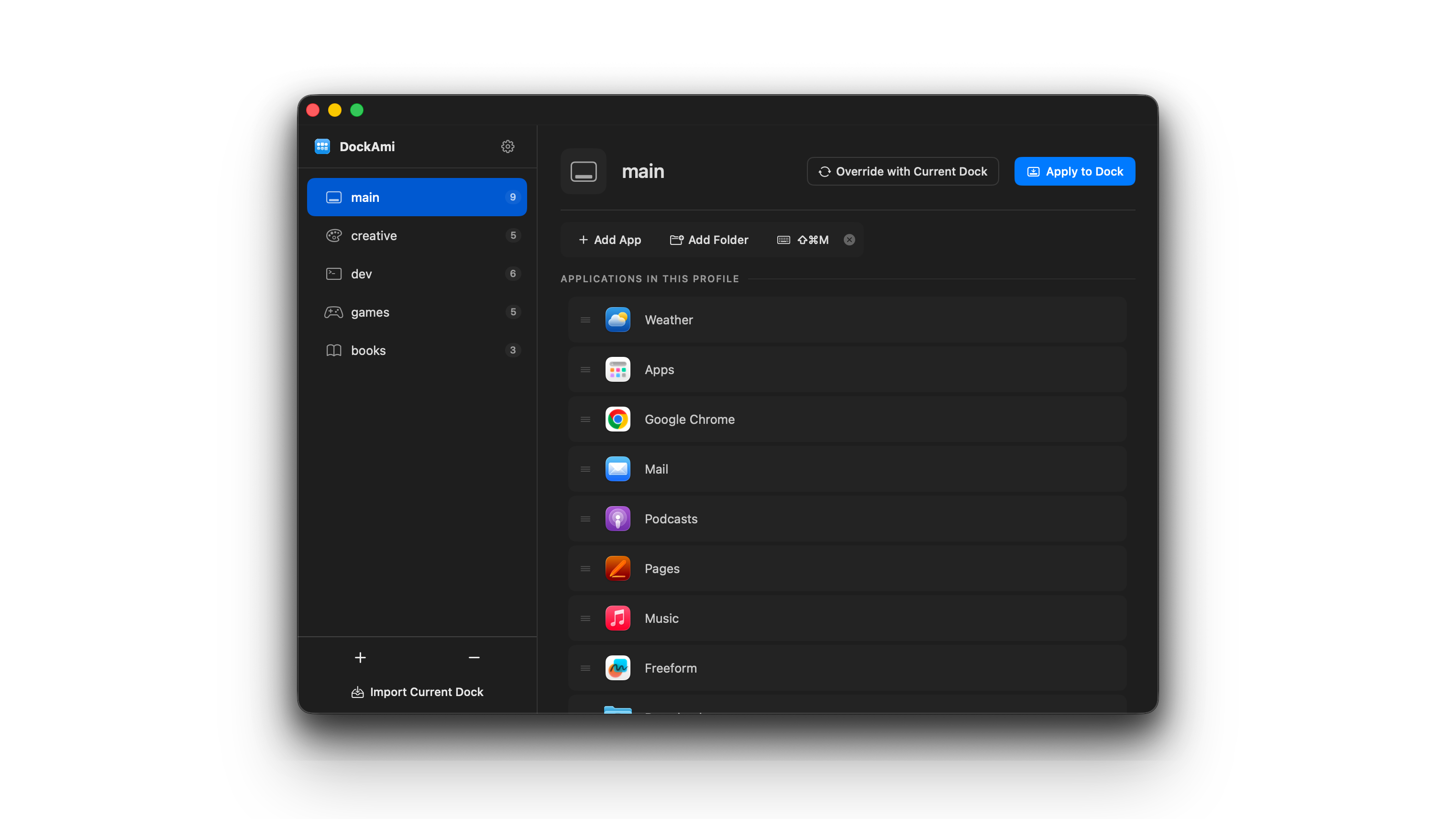 Create multiple Dock profiles and switch between them in a click. One Dock for coding, another for design, another for music — you decide.